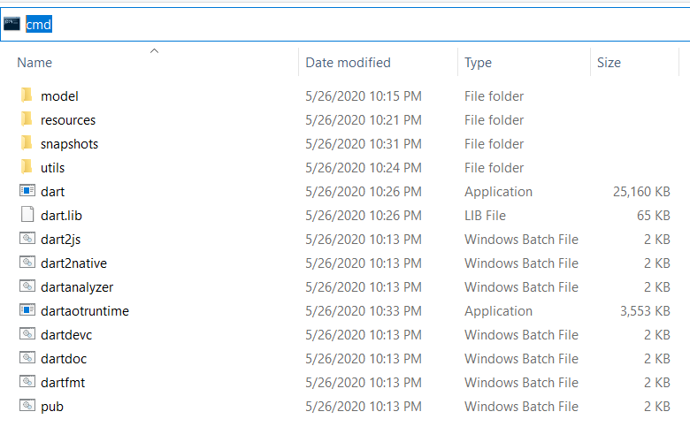 Step 3: Running Dart. Now open bin folder and type “cmd” as given below: