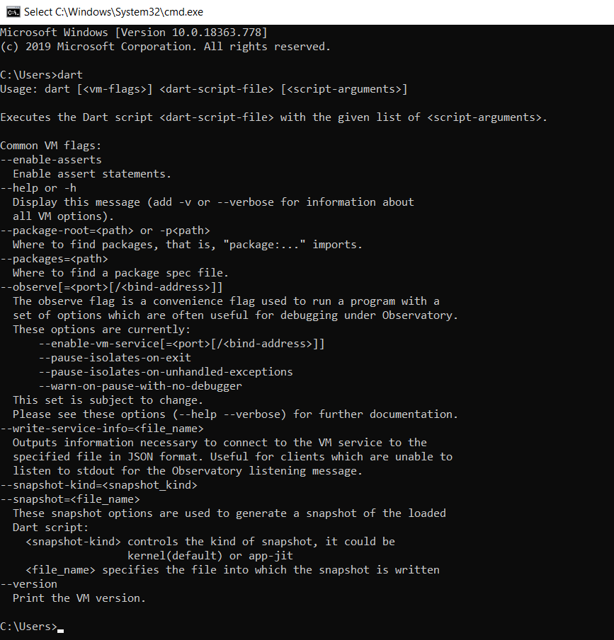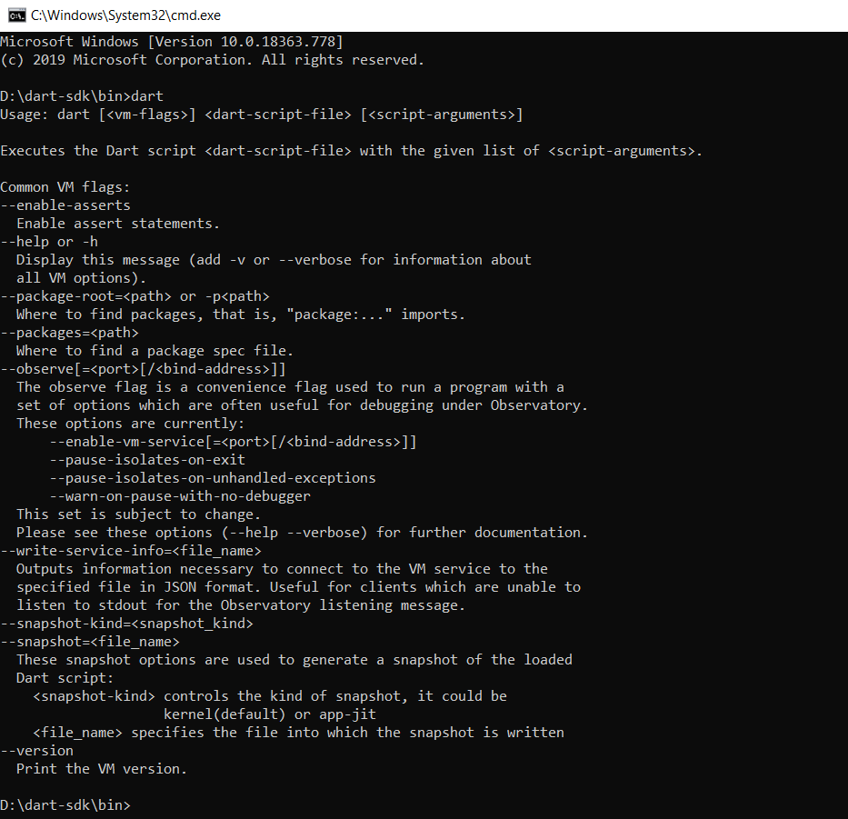 Command Prompt will open with our desired path of bin folder and now type “dart”.